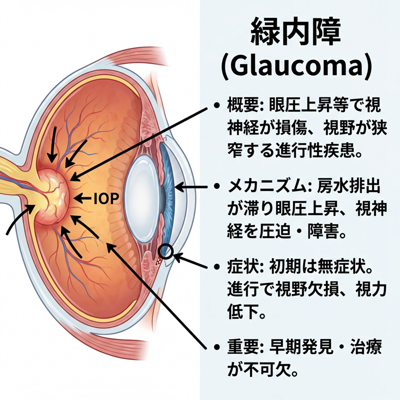 緑内障は、視神経が障害されることで視野が徐々に狭くなる病気です。