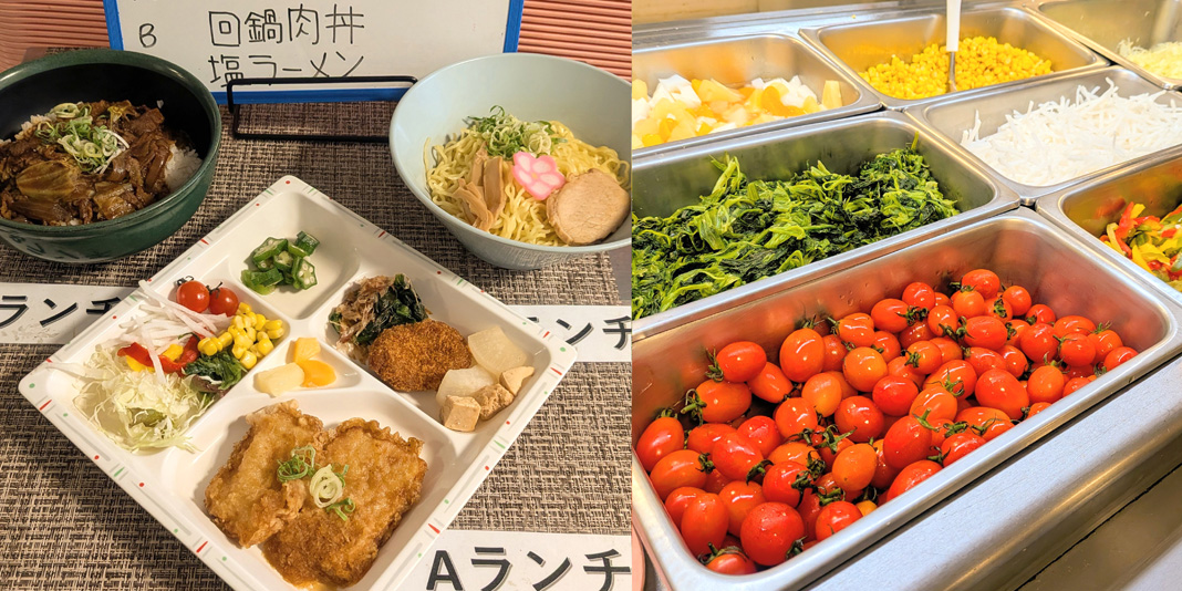 ハーフバイキング形式で、メインは定食・丼物・麺類から選ぶことができます。
