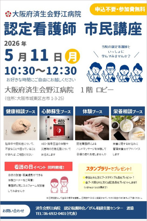 | お問合せ | 大阪府済生会野江病院 認定看護師会/がん相談支援センター 渡邉 TEL:06-6932-0401(代表) |